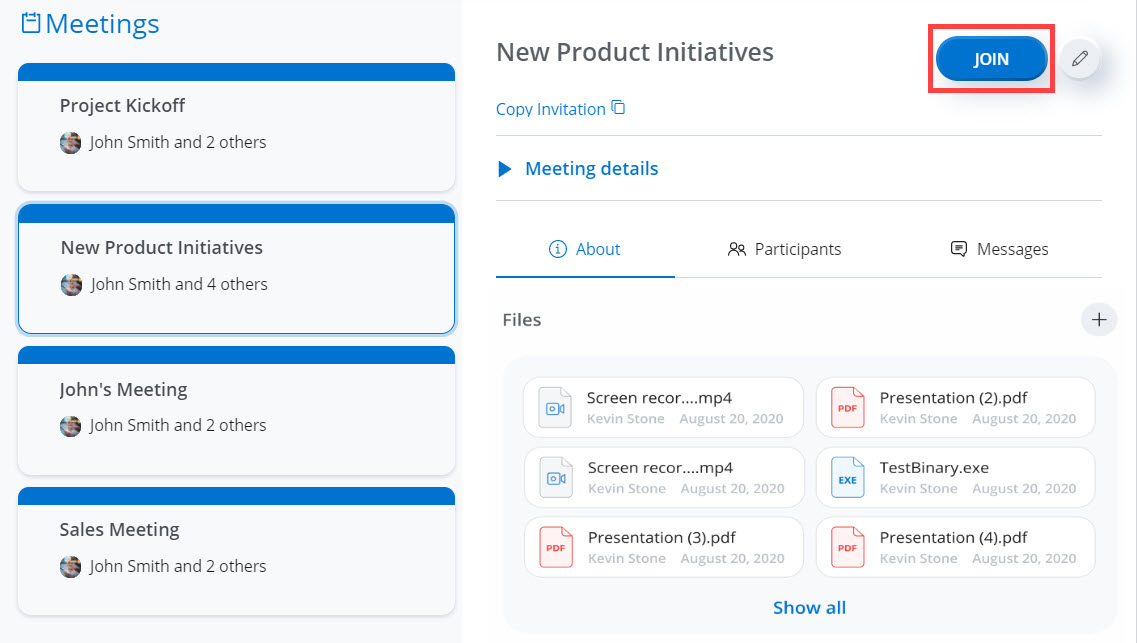 - Klicken Sie auf das Meeting, dem Sie beitreten möchten. Die Daten des Meetings werden auf der rechten Seite der Anwendung angezeigt.