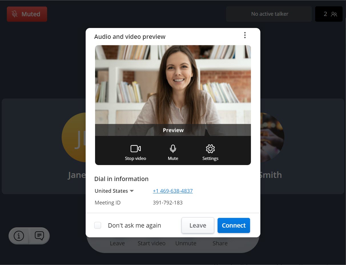 - Wählen Sie aus, wie Sie eine Audioverbindung herstellen möchten, ob Sie Ihr Mikrofon stummschalten oder aufheben möchten und ob Sie Ihr Video ein- oder ausschalten möchten, bevor Sie dem Meeting beitreten. Klicken Sie auf Verbinden, um dem Meeting beizutreten. Wenn Sie auf Verlassen klicken, wird der Vorgang abgebrochen und Sie werden zum Menü Meetings der Anwendung umgeleitet.Note: