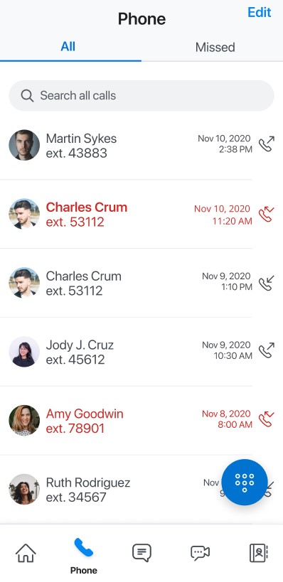 Call history is synchronized with the consolidated directory contacts configured through the PBX (OIP/AD/Public and Private Phonebook). If the application is synchronized with the Office 365 account of a user, the call history screen will display the user's name and details from the contacts if it exists.
