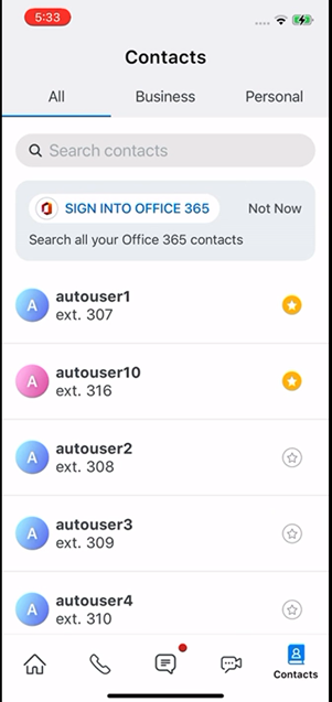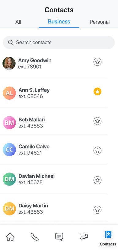 - Business — Displays all contacts from the PBX and corporate Office 365 contacts.