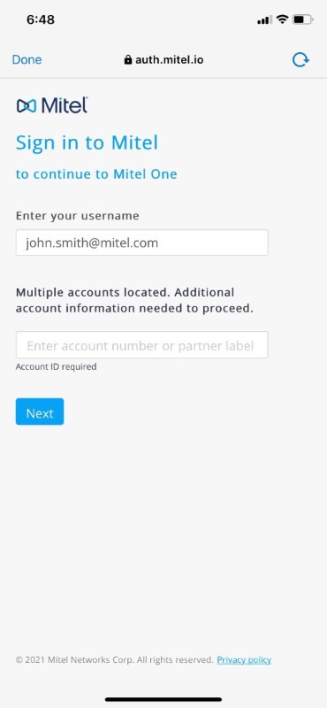 - Enter the email address (specified in the account for the user) in the Enter your email address field and tap Next. If your email address is registered with multiple customer accounts, the message Multiple accounts located. Additional account information needed to proceed is displayed and the Account ID field appears. Enter the Account ID, and tap Next.