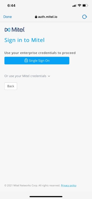 Note: You can use SSO to log in to the application only if your IT administrator has configured Single Sign-On (SSO) for your Mitel account.