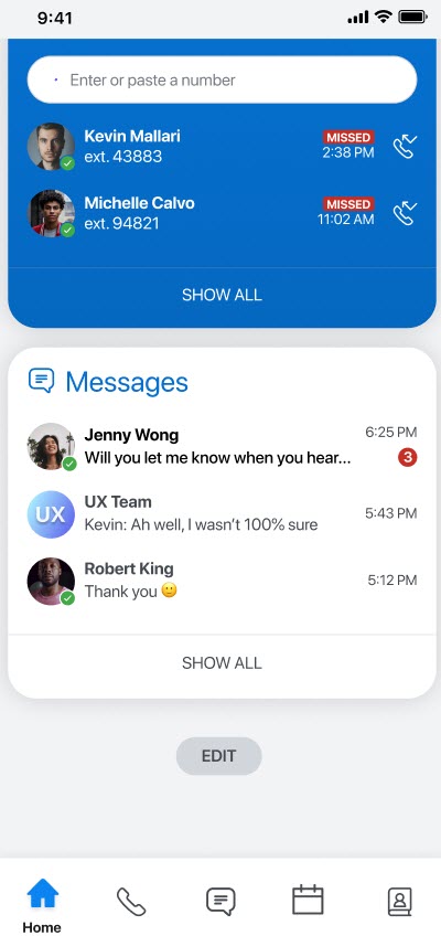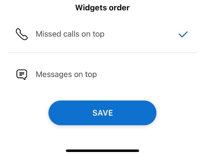 You can organize only the Missed Calls widget and the Messages widget in the Mitel One Mobile application. You do not have an option to move the Quick Functions widget. To change the order of all widgets including the Quick functions widget, rearrange them in the Mitel One Web application. The change will reflect in the Mitel One Mobile application.