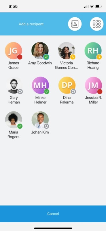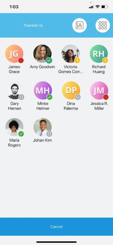 - The Transfer to screen opens, where you can select the contact and then transfer the call by doing one of the following:
