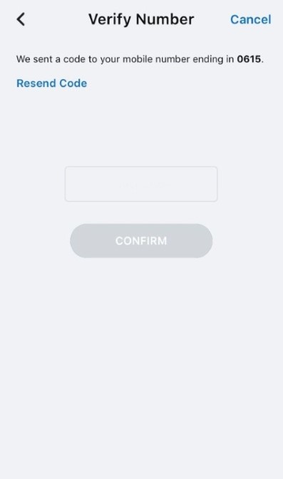 - In the Verify Number screen that opens, enter the code in the field provided and tap CONFIRM. If you do not receive a text message containing the code, tap Resend Code.