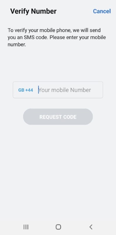 - In the mobile verification screen, select your resident country by using the drop-down menu and enter your mobile number. Tap REQUEST CODE. You will receive a six-digit code on the mobile number you entered.