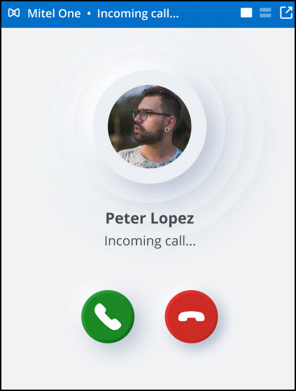 The Mitel One web application displays a call screen with the options to accept or decline every incoming call. Click to answer the call or