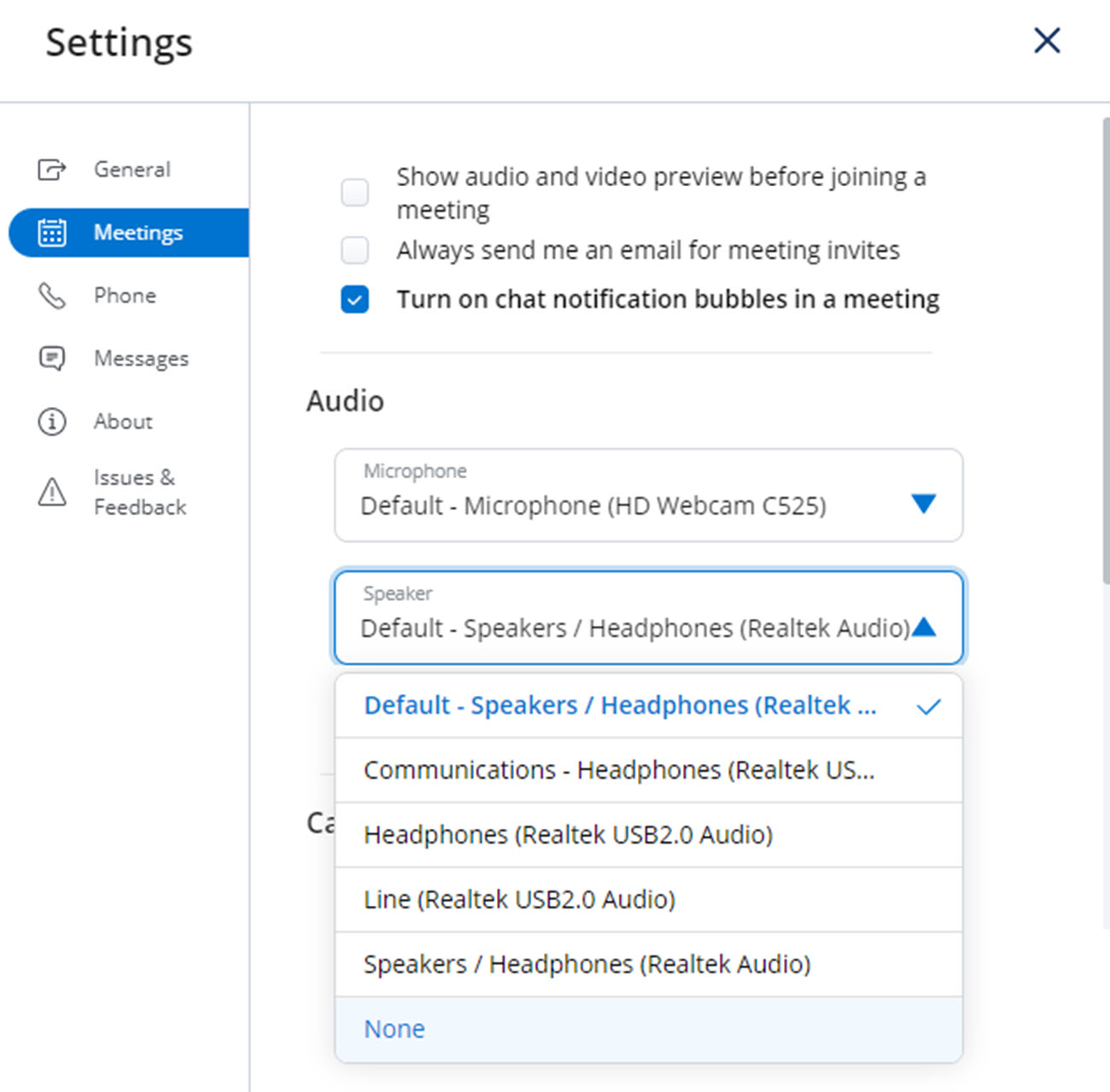 - If you place or receive a call during an ongoing meeting, it is recommended that you set the Speaker to None (to mute the audio of the meeting) in Google Chrome or Microsoft Edge browser, so that the meeting audio does not distract the call audio.