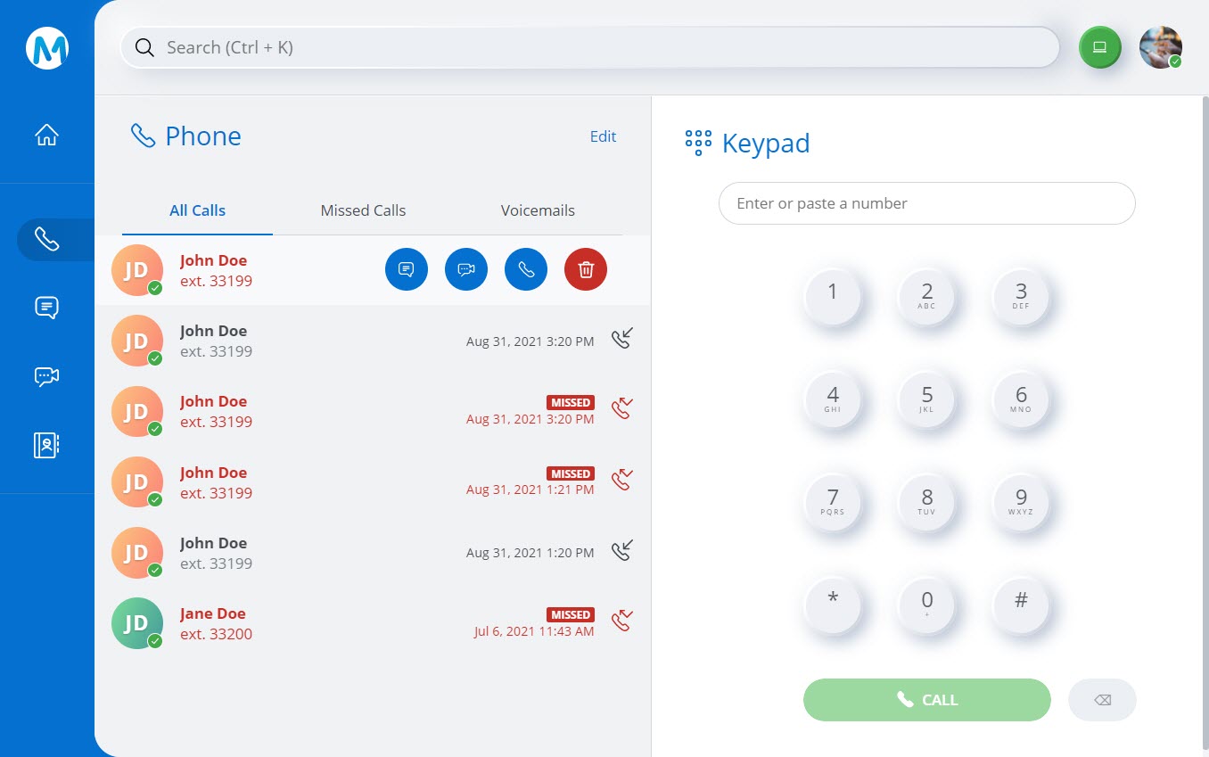 The call history screen of the Mitel One web application enables you to view all outgoing, incoming, missed calls, and voicemails, place a call, start a message or a meeting with any individual or group contacts in the call history, and delete a call history item.