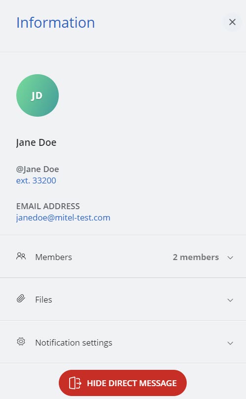 The Information panel in a Direct Message displays the information of the contacts (name, extension number, email address, and avatar) with whom you are messaging, the members involved in the message, the files shared in the message, the option to mute or unmute the notification for the message, and the option to hide the message.