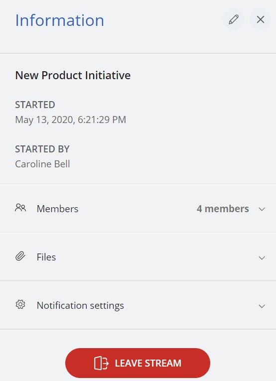 The Information panel in a Stream displays Stream start date, name of the contact who started the Stream, the members in the Stream, the files shared in the Stream, the option to enable or disable notifications for the Stream, the option to invite contacts to the stream, the option to leave the stream, and the option to edit the details of the Stream.