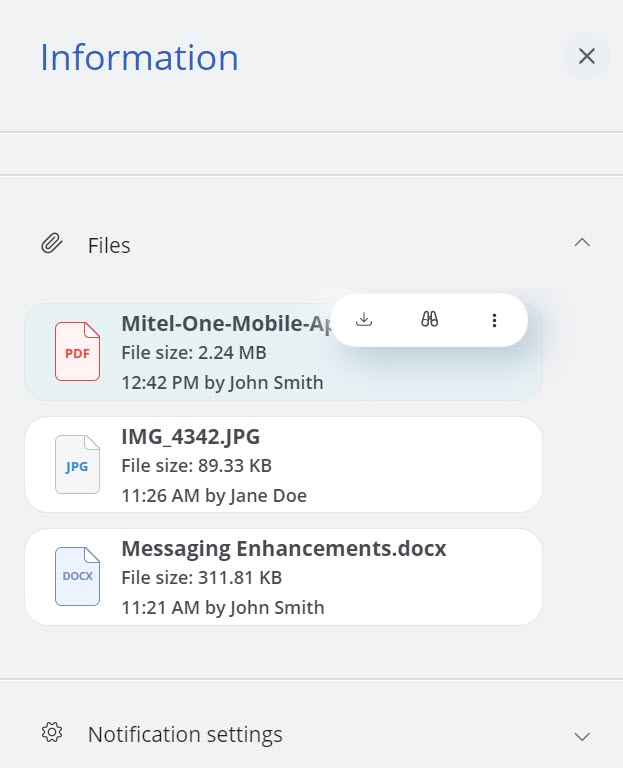 Mitel One allows users to preview, download, and delete the files shared in a Stream or a chat conversation.