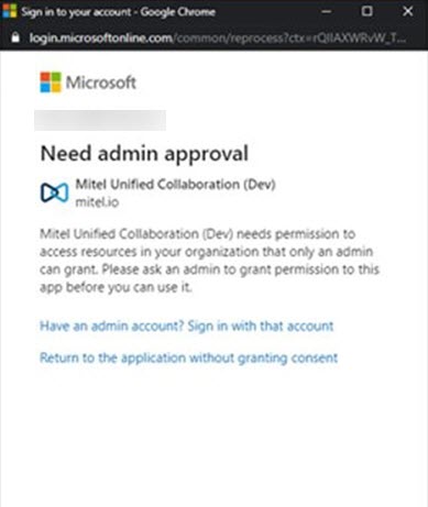 Note: Contact your CloudLink Account administrator or see the topic Integrating Microsoft Office 365 with Mitel Administration if you are not able to synchronize the Office 365 contacts using this option or if the message shown in the following screen capture is displayed.