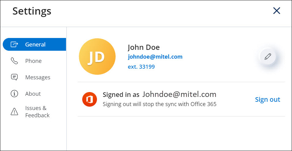 - The personal contacts in your Office 365 account will not be synchronized when you log out of the Mitel One web application. Therefore, you must enable the application to access the personal contacts on your Office 365 application by signing in to the Office 365 account each time you log in to the application.