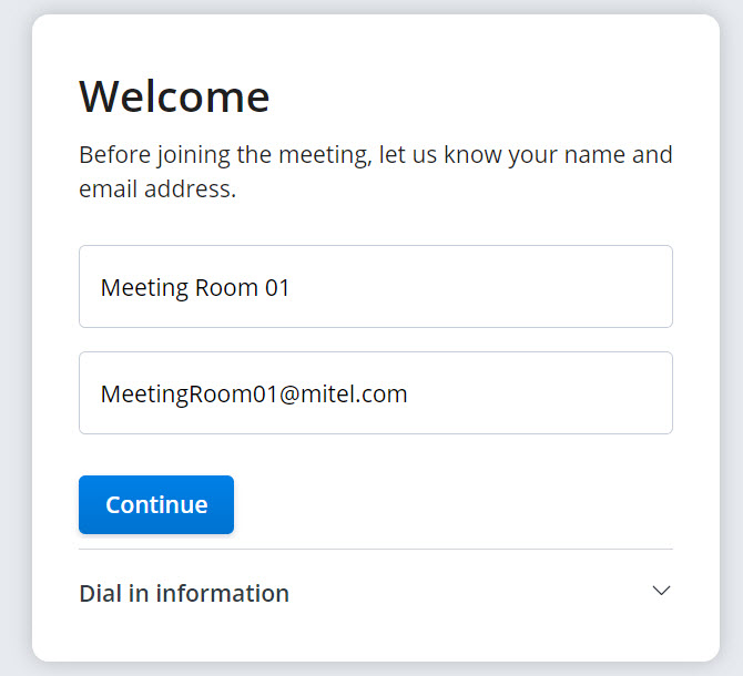 The Welcome page opens, displaying the meeting room name and the email address.
