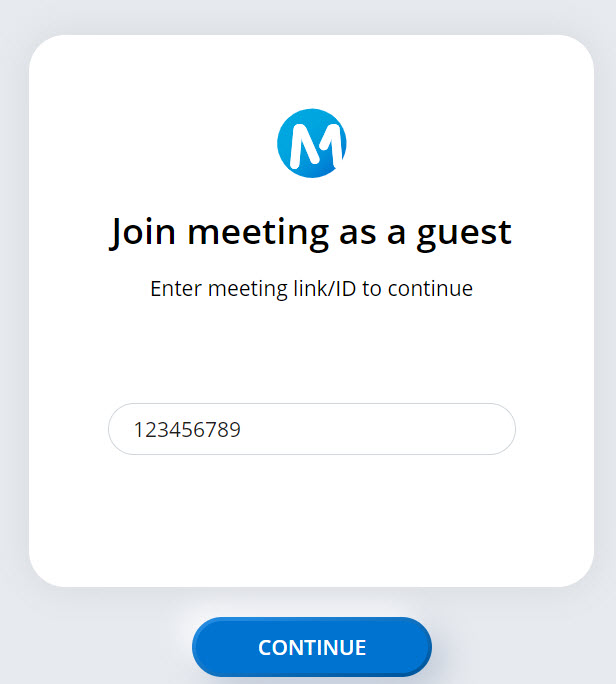 - Enter the meeting link or the meeting ID in the field provided, and click CONTINUE.