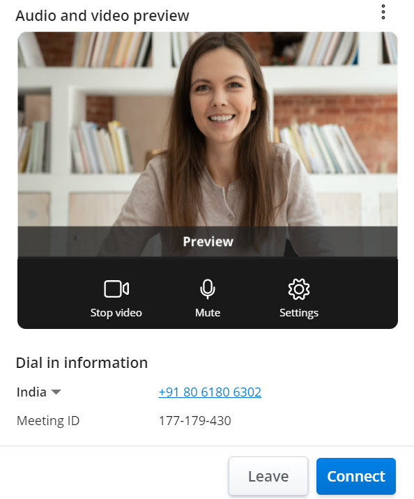 - In the Audio and video preview panel, choose whether you want to mute or unmute your microphone and turn on or turn off your video before you join the meeting. Click Connect to join the meeting. Clicking Leave will abort the operation and redirect you to the Welcome page.
