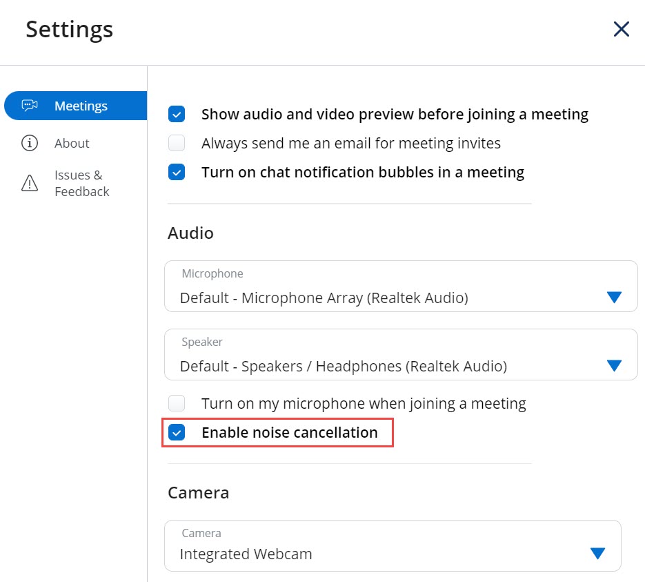 Note: The Noise Cancellation feature will not be enabled by default. You must enable it from the Settings panel of the application during a meeting.