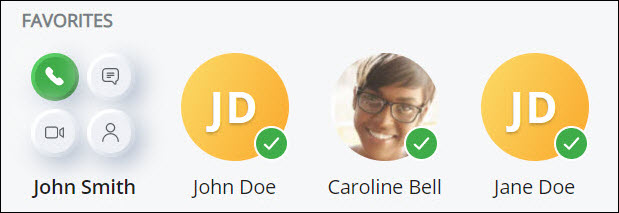 Hover over any contact in the FAVORITES widget and click the phone icon to dial the primary telephone number for this contact.
