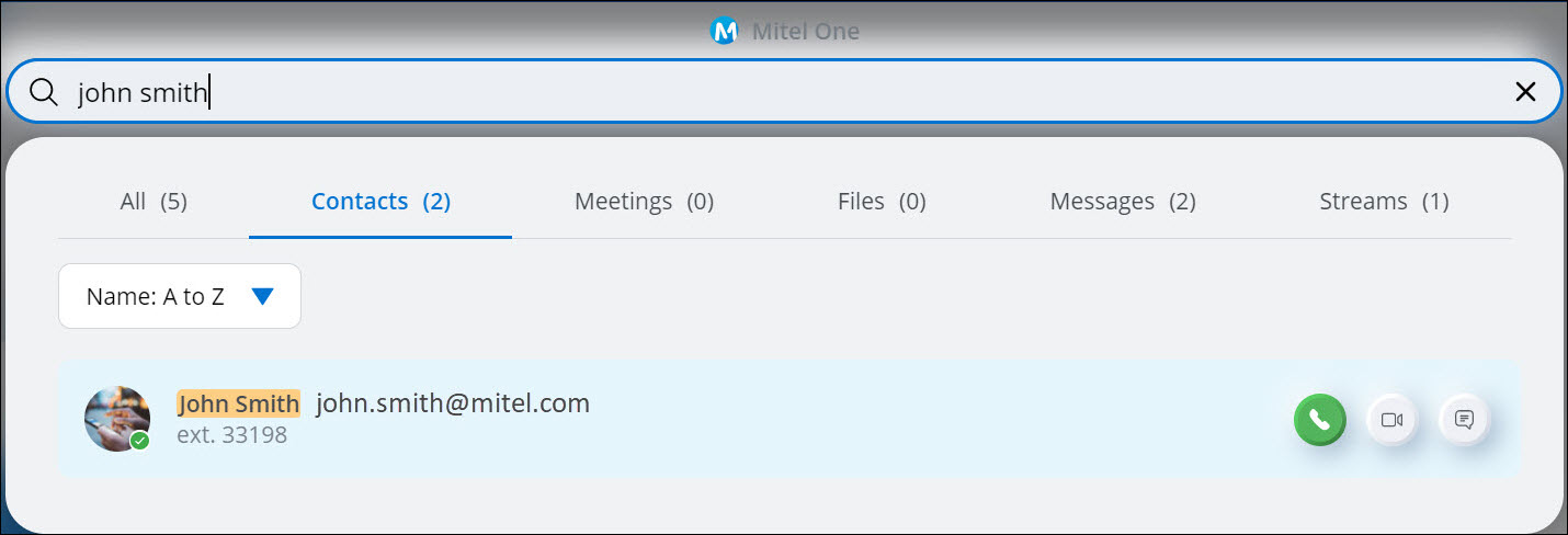 - In the Search area, type the first few letters of the contact's first name or last name. From the contact list, hover over the contact you want to call and click the phone icon (