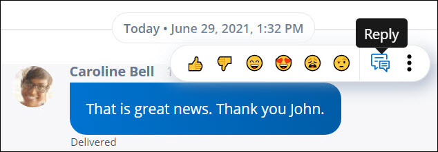 - In the text area, type a response. You can react (send emojis) or reply to instant messages. To react to an instant message, from a conversation window, hover over the message and select emojis or the reply option.
