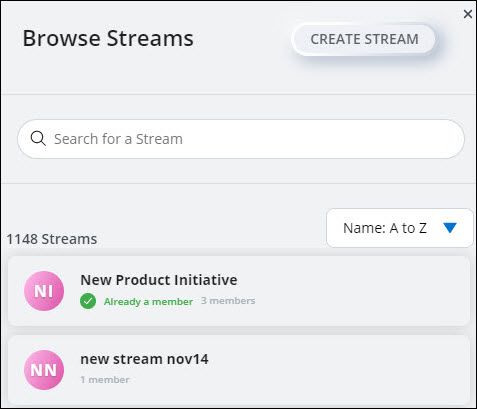 icon in the Streams section, and from the panel that opens, click Browse Streams. A panel opens displaying a list of public Streams.