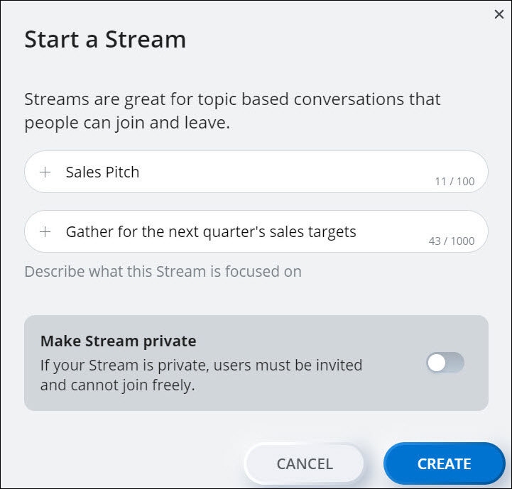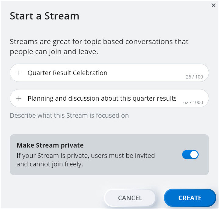 - Choose a different name, and describe what the Stream is about in the Description field. To set the Stream as private, slide the Make Stream private toggle button to the right.