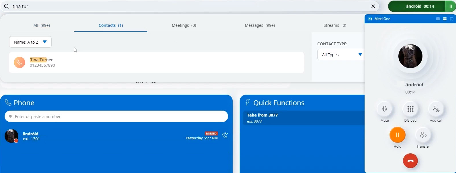 The Call Transfer feature in the Mitel One web application allows you to redirect an ongoing call from your computer to another number. When the transfer is successful, you are disconnected from the call and the call to the redirected number becomes the active call. Either person on a call can transfer the call. Mitel One web application supports two types of call transfers: Blind Transfer and Supervised Transfer.