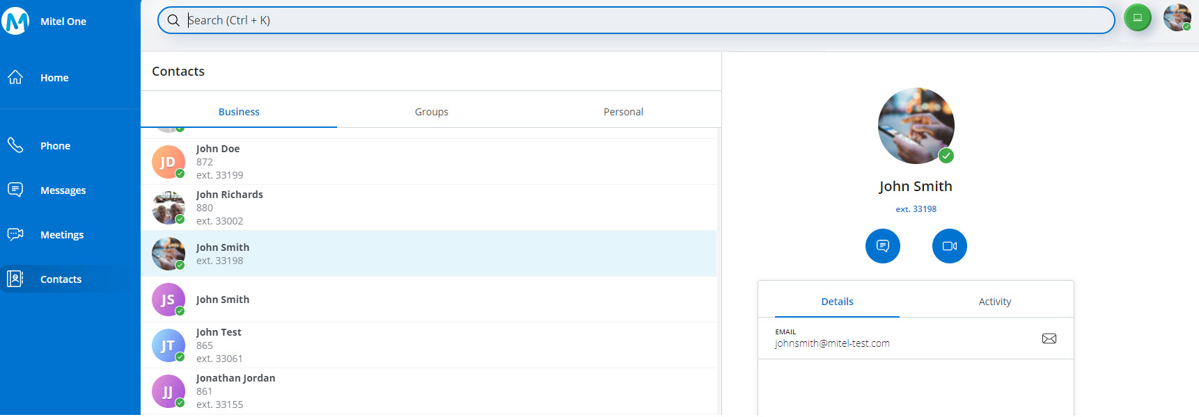 El menú Contactos de Mitel One web application brinda acceso a sus contactos comerciales y personales.