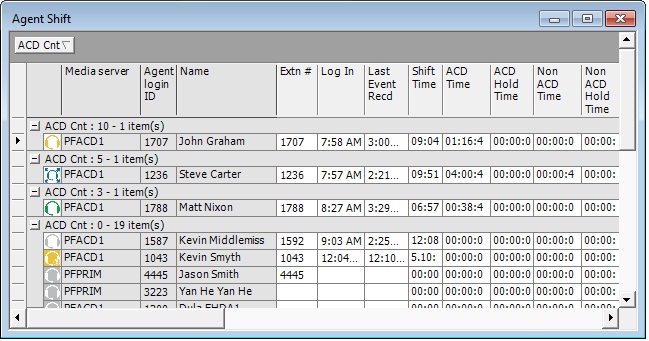 You can group rows of data in the Queue Now monitor, and other monitors that contain columns. For example, you can group the data by the ACD count statistic and readily see which agents handled the most calls, and which agents handled the least calls, as illustrated in the following figure.