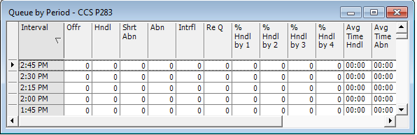 The Queue by Period monitor collates queue statistics by 15-minute intervals over a 24-hour period. The monitor refreshes each time there is a change in a statistic and each 15-minute interval. The Queue by Period monitor always displays the current 15 minute interval at the top of the monitor. You can specify which columns of statistics are displayed, rearrange columns, and sort individual columns in ascending or descending order. (See the following figure.)