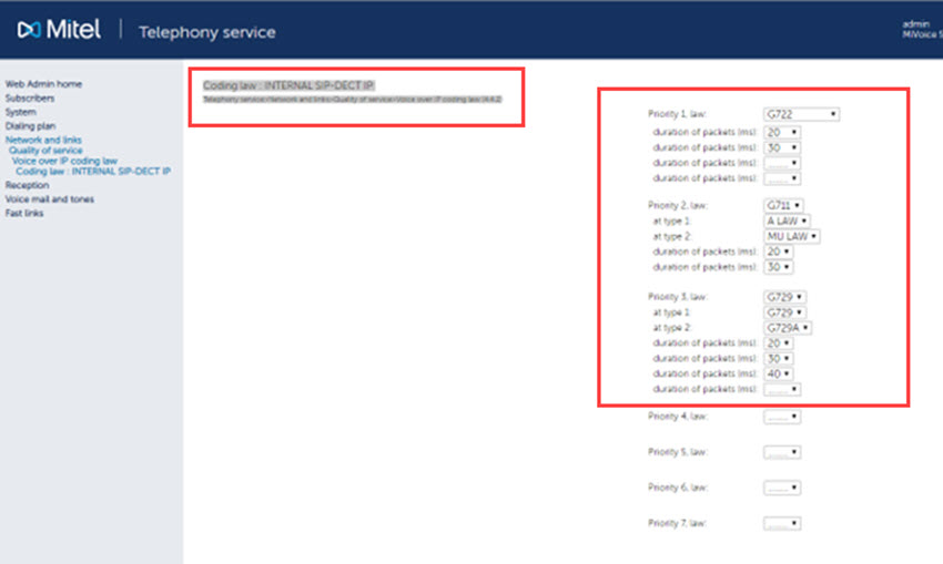 Telephony service > Network and links > Quality of service > Voice over IP coding law (4.4.2)