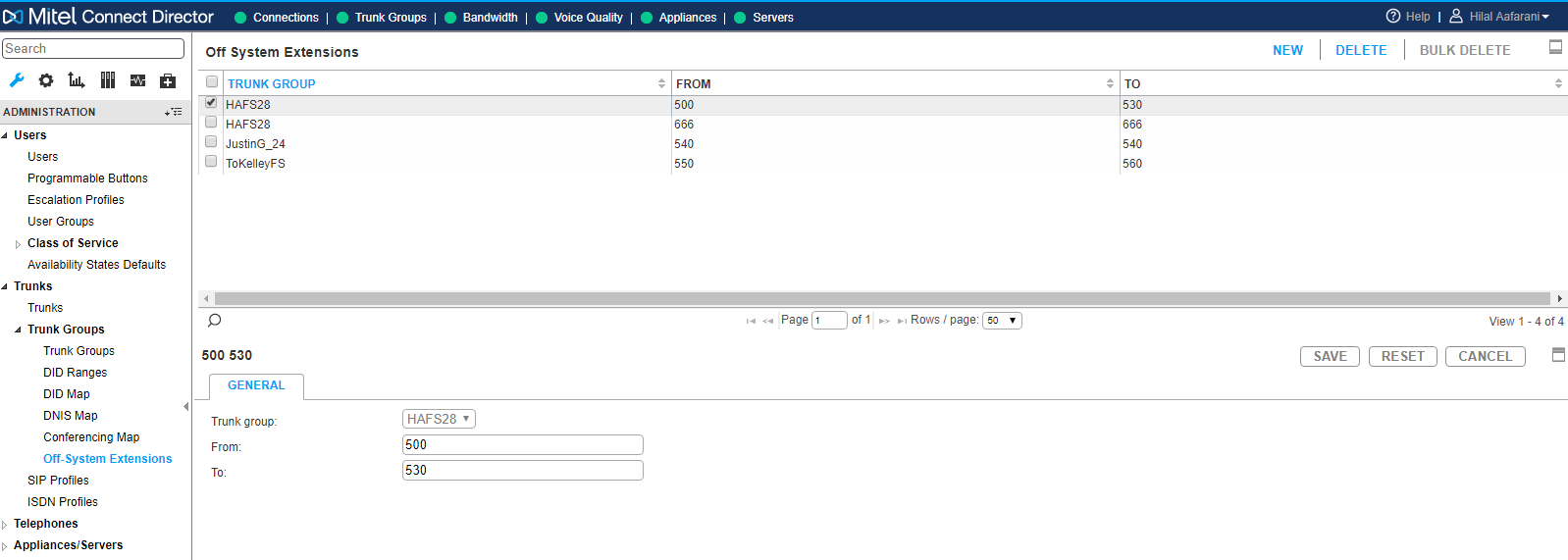 - In the Mitel Connect Director, go to Trunk Groups > Off-System