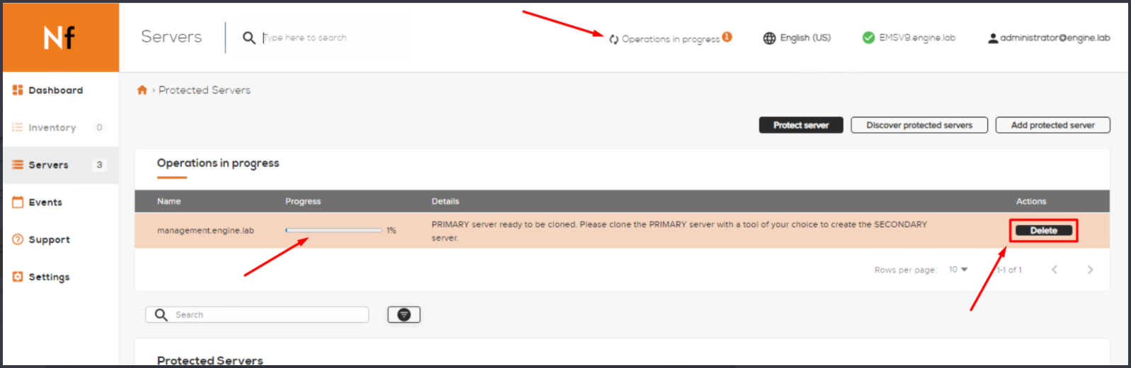 - We now must wait until the Primary server is reconfigured in order to be ready for cloning. This is displayed in EMS as below. Please focus on the Operations in progress status and on the Progress Bar showing the reconfiguration of the Primary server. When this is completed the Delete button will become available.