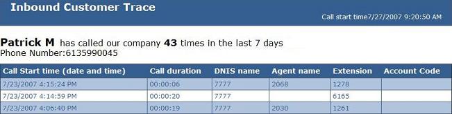 - If you want to display call statistics for incoming ACD calls, select Display the caller-specific Inbound trace report Web page. The Inbound Trace report tells you the number of times the caller has called in the last seven days and contains the following fields: Call Start Time, Call Duration, DNIS name, Agent name, Extension, and Account Code. (See the following figure.)