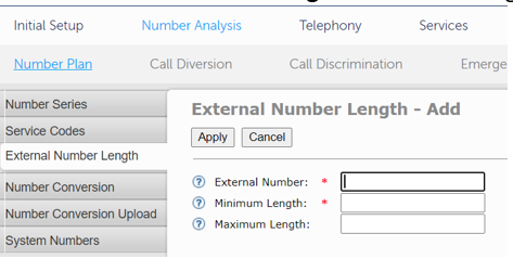 - Go to, Number Analysis > Number Plan > External Number Length and click Add.