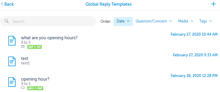 Note: If you enter a search keyword before creating a new template, and that search keyword doesn't match the Question/Concern, template or tags in the new template you're creating, After you save, you will not find that template in the list (you must first remove the search string before you see that new template in the list).