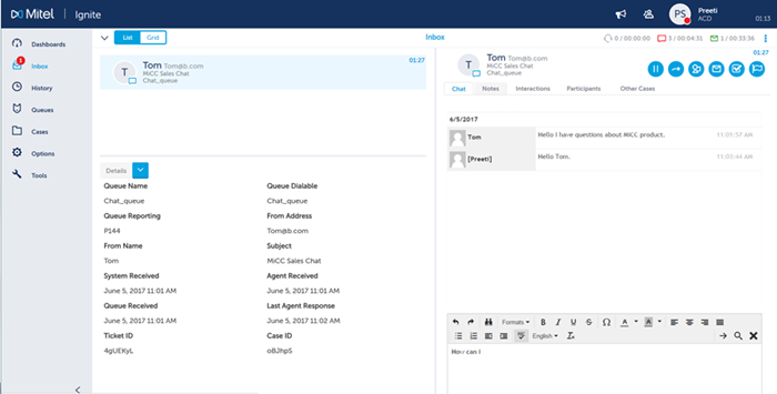 Ignite’s Inbox displays all interactions currently handled by the employee, ringing the employee, drafts, as well as failed send and autoreply items belonging to the employee.