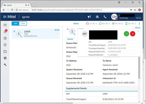 - In the Ignite toaster, click Accept. Alternatively, select the call or hover over the item avatar and click Accept.