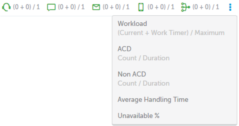 - ACD (Count / Duration) -- Displays the number of ACD interactions the agent has handled for a media type, and the time spent handling interactions of that media type