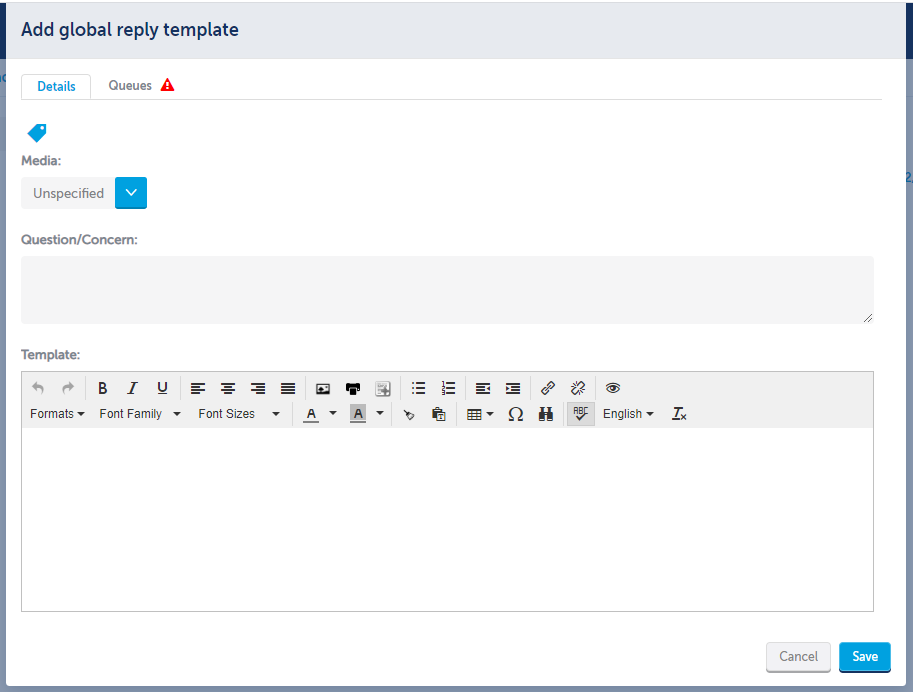 - Details tab - Allows you to add tags, media, question/concern, and the template content with text.