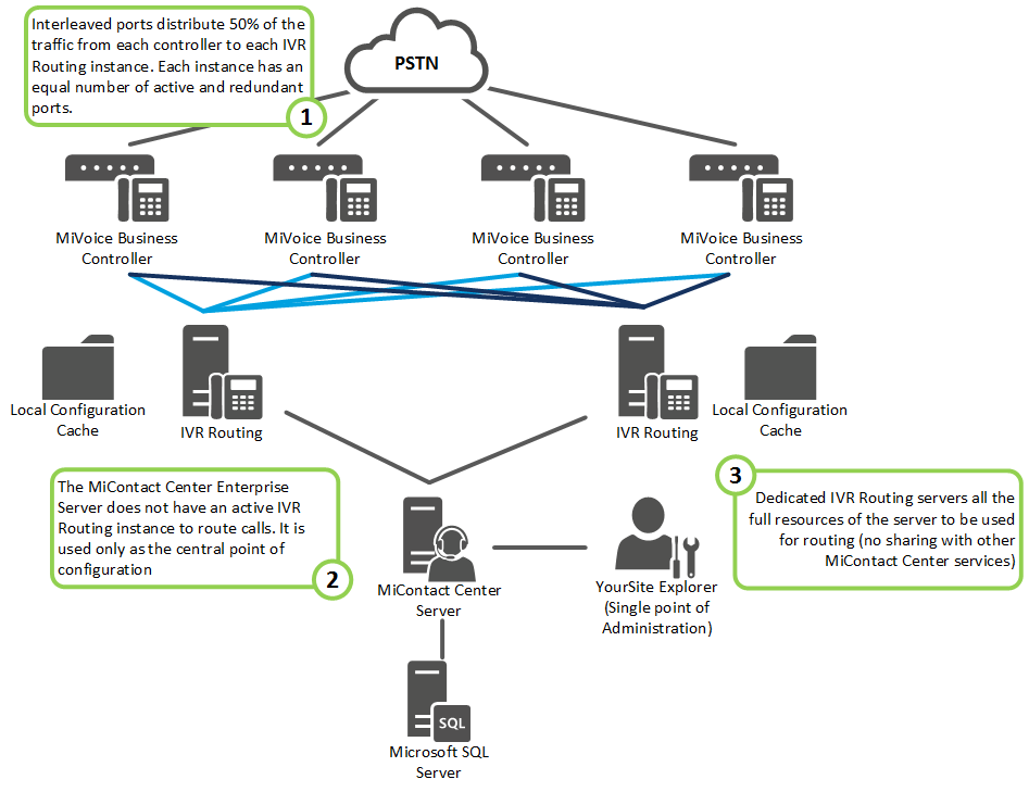 IVR Routing high availability configuration consists of fully resilient controllers with dedicated highly available IVR Routing instances. Remote IVR Routing instances can be geographically dispersed to provide an added level of redundancy. In this configuration, we suggest IVR Routing not be installed on the Enterprise Server to avoid overloading the Enterprise Server hardware components. Each IVR Routing instance is on a dedicated server with a mirror of the Enterprise Server configuration information. If the Enterprise Server fails, all IVR Routing instances are unaffected. By making the telephone systems redundant in this configuration, if one IVR Routing instance fails, the remaining instances will pick up traffic from the telephone systems (up to the limitations of the hardware).