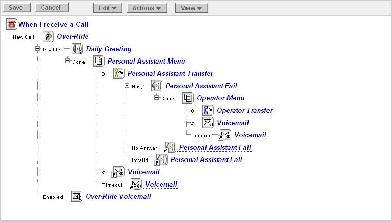 This window displays the current structure of the call flow, showing how the results of each action flow into subsequent actions.