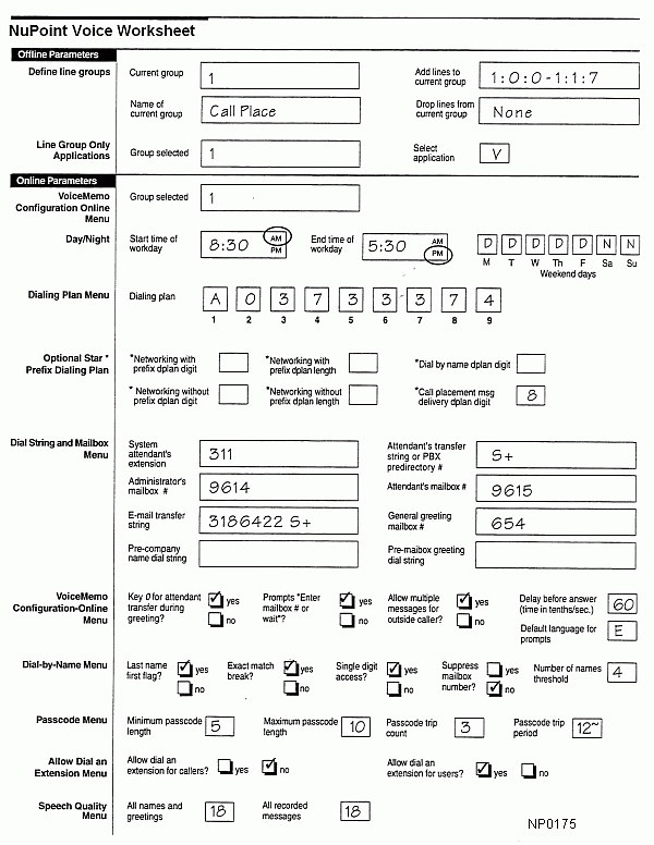 If you are including call placement in this application, establish a dialing plan on this worksheet that tells the server that mailboxes starting with the specified digit are actually telephone numbers. See the NuPoint Voice Application section for more information. A sample NuPoint Voice Application Worksheet for call placement is shown here: