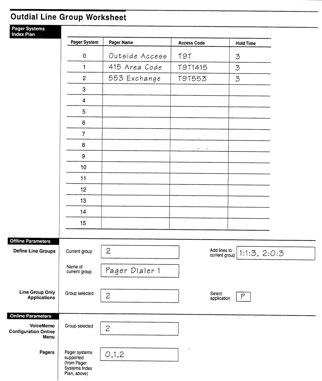 The Outdial Line Group Worksheet organizes information you need to configure the line group that outdials paging and message delivery calls and identify the pager system. A sample Outdial Line Group Worksheet for paging is shown here: