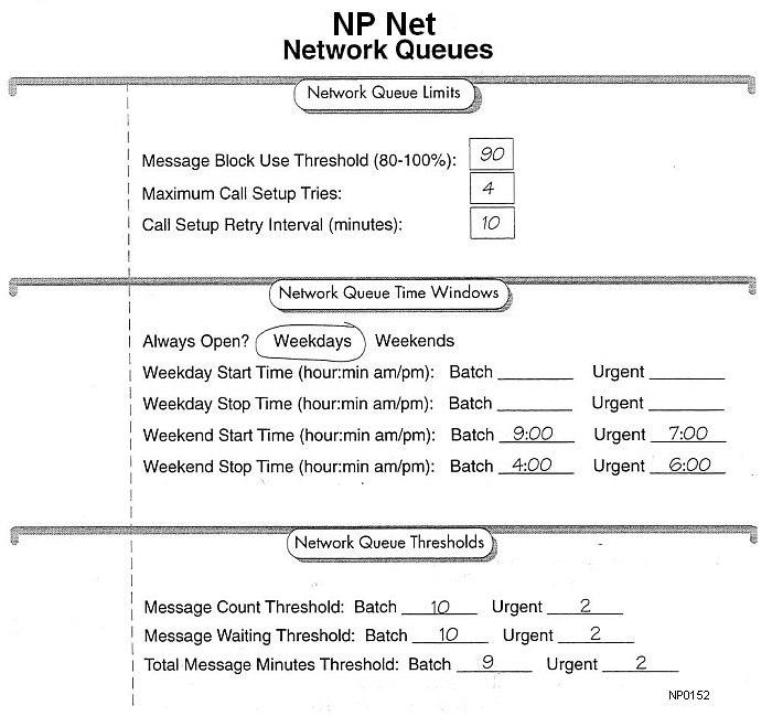 You can set different network queue thresholds and time windows for urgent and batch messages. (All messages not specifically marked urgent by the sender are considered batch.) With this two-tiered system, routine messages are sent at a time when the call is more economical, while more important messages are delivered promptly. (It is recommended that you set realistic batch limits or restrict the assignment of Network Classes of Service that allow the user to send urgent messages over the network to prevent users from marking all remote messages urgent.) The batch queues and remote queues of each remote node are monitored individually by NP Net.