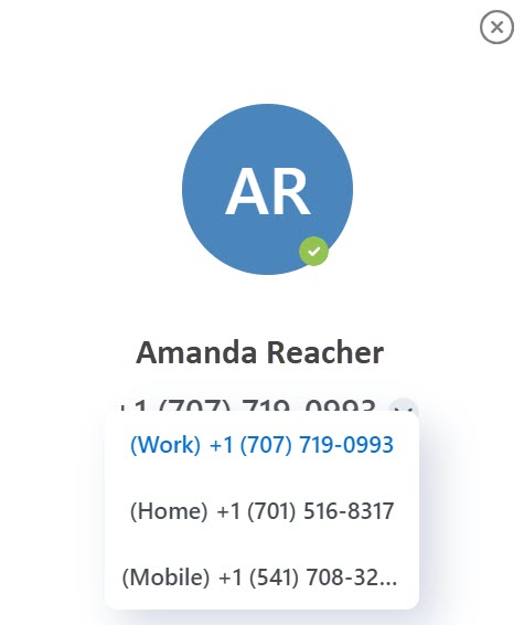 Click the name to select that contact. A window opens displaying the name, default number, and avatar of the contact. Click the