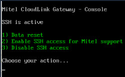 Il menu Console Console in CloudLink Gateway permette l'esecuzione locale di comandi per il gateway fisico e virtuale. Funzioni come il Ripristino dei dati, il Ripristino impostazioni predefinite, l'Abilitazione/disabilitazione dell'accesso SSH per il supporto Mitel possono essere eseguite usando questi comandi.