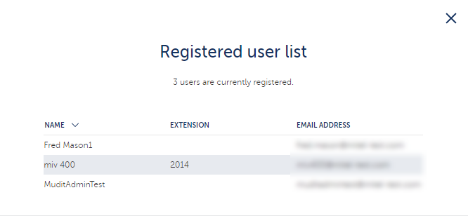 Per visualizzare l'elenco di tutti gli utenti che hanno finito di completare il loro account, fare clic sull'opzione Mostra utenti registrati. Si apre la pagina Elenco utenti registrati (vedere la figura seguente) in cui sono elencati il nome, il numero dell'interno telefonico e l'indirizzo e-mail di tutti gli utenti registrati.