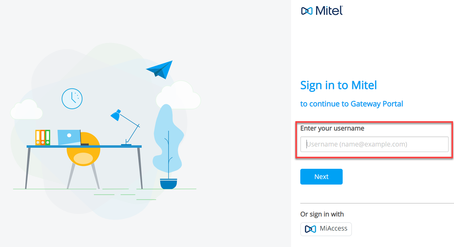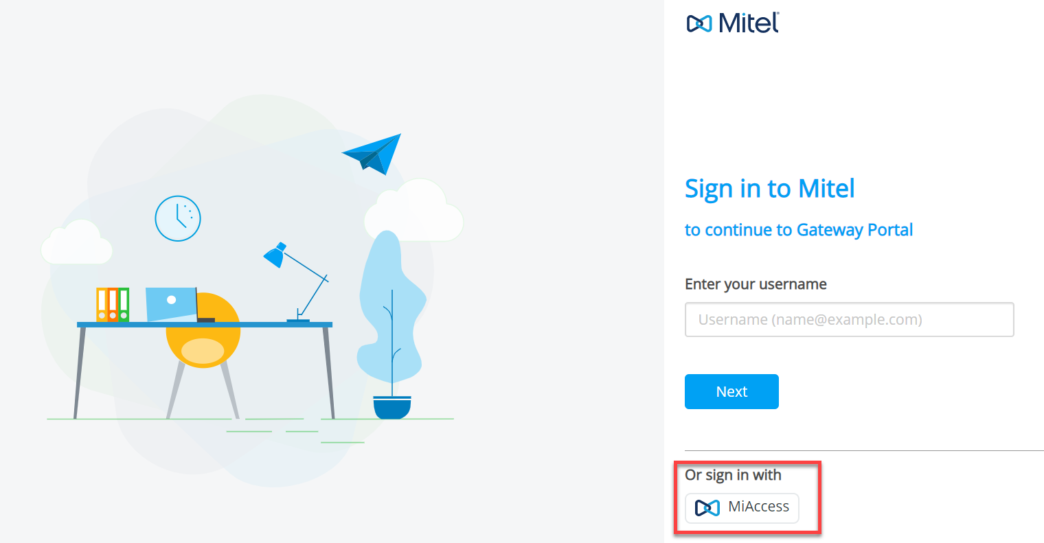 Per accedere, un Partner Mitel deve fare clic sul pulsante MiAccess nella schermata di accesso del portale Gateway. Nella pagina di accesso di Mitel MiAccess, inserire le proprie credenziali MiAccess e fare clic su ACCEDI per accedere al portale CloudLink Gateway.